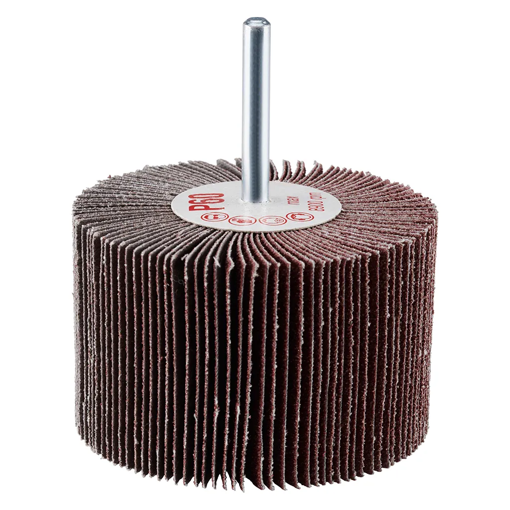 La roue à lamelles FS de RHODIUS a été conçue pour être utilisée sur les meuleuses droites ou les machines à entraînement d’arbre flexible avec logement de tige de 6 mm.
