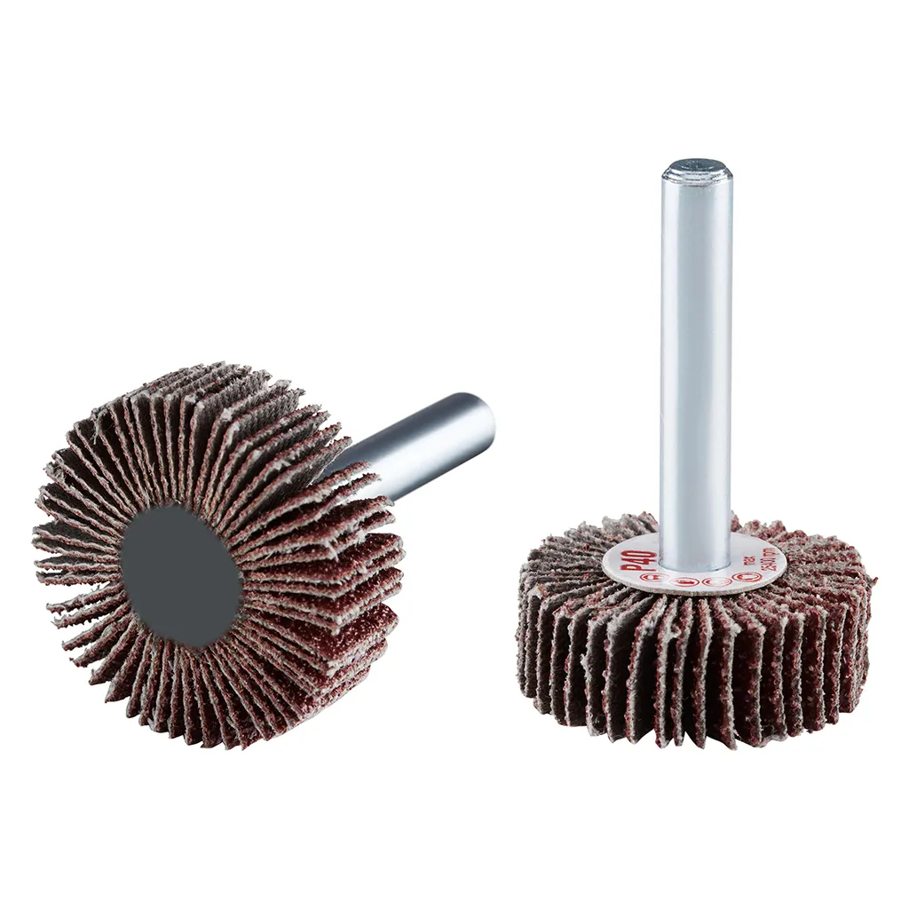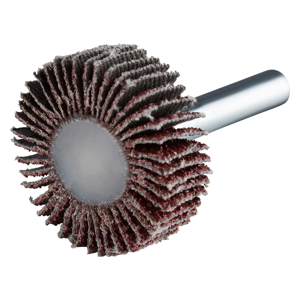 La roue à lamelles FS de RHODIUS a été conçue pour être utilisée sur les meuleuses droites ou les machines à entraînement d’arbre flexible avec logement de tige de 6 mm.