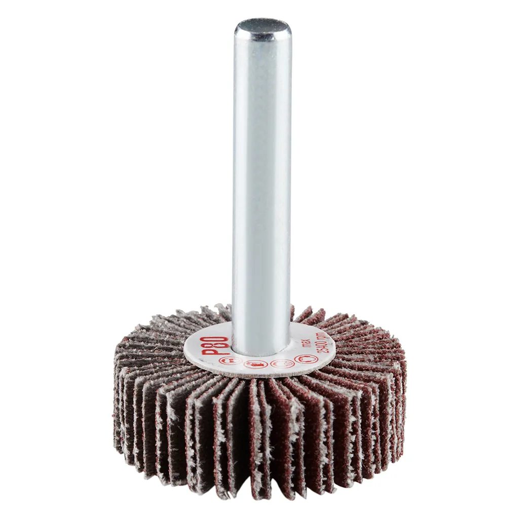 La roue à lamelles FS de RHODIUS a été conçue pour être utilisée sur les meuleuses droites ou les machines à entraînement d’arbre flexible avec logement de tige de 6 mm.