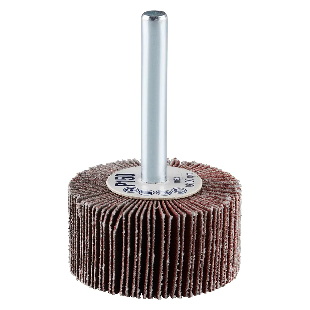 La roue à lamelles FS de RHODIUS a été conçue pour être utilisée sur les meuleuses droites ou les machines à entraînement d’arbre flexible avec logement de tige de 6 mm.