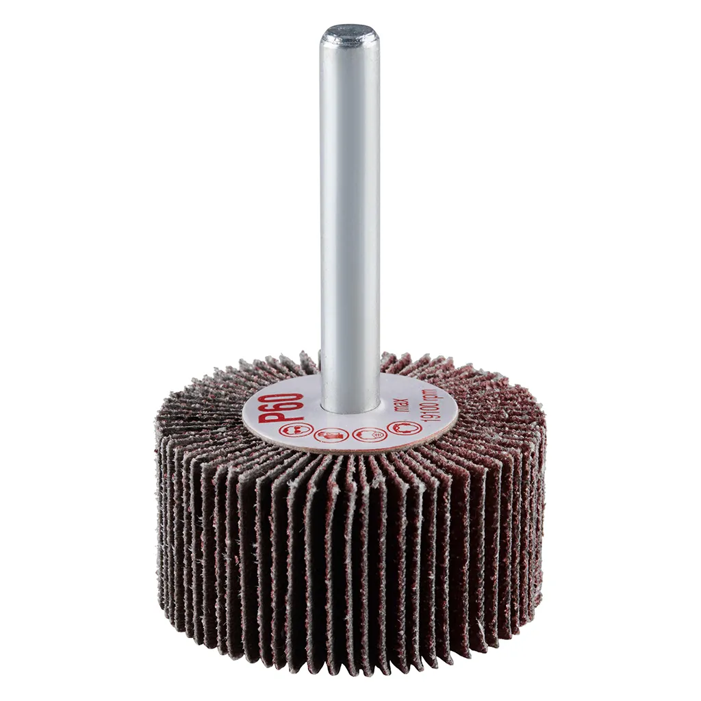 La roue à lamelles FS de RHODIUS a été conçue pour être utilisée sur les meuleuses droites ou les machines à entraînement d’arbre flexible avec logement de tige de 6 mm.