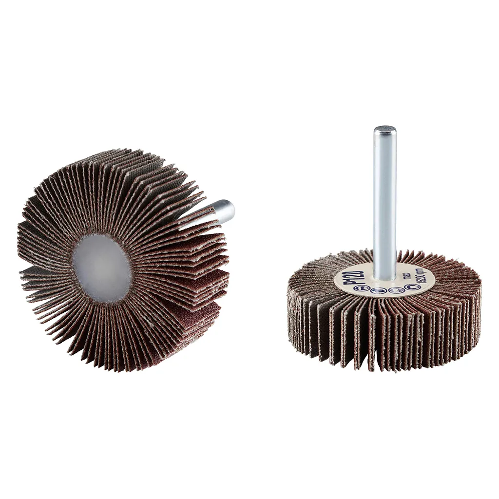 La roue à lamelles FS de RHODIUS a été conçue pour être utilisée sur les meuleuses droites ou les machines à entraînement d’arbre flexible avec logement de tige de 6 mm.