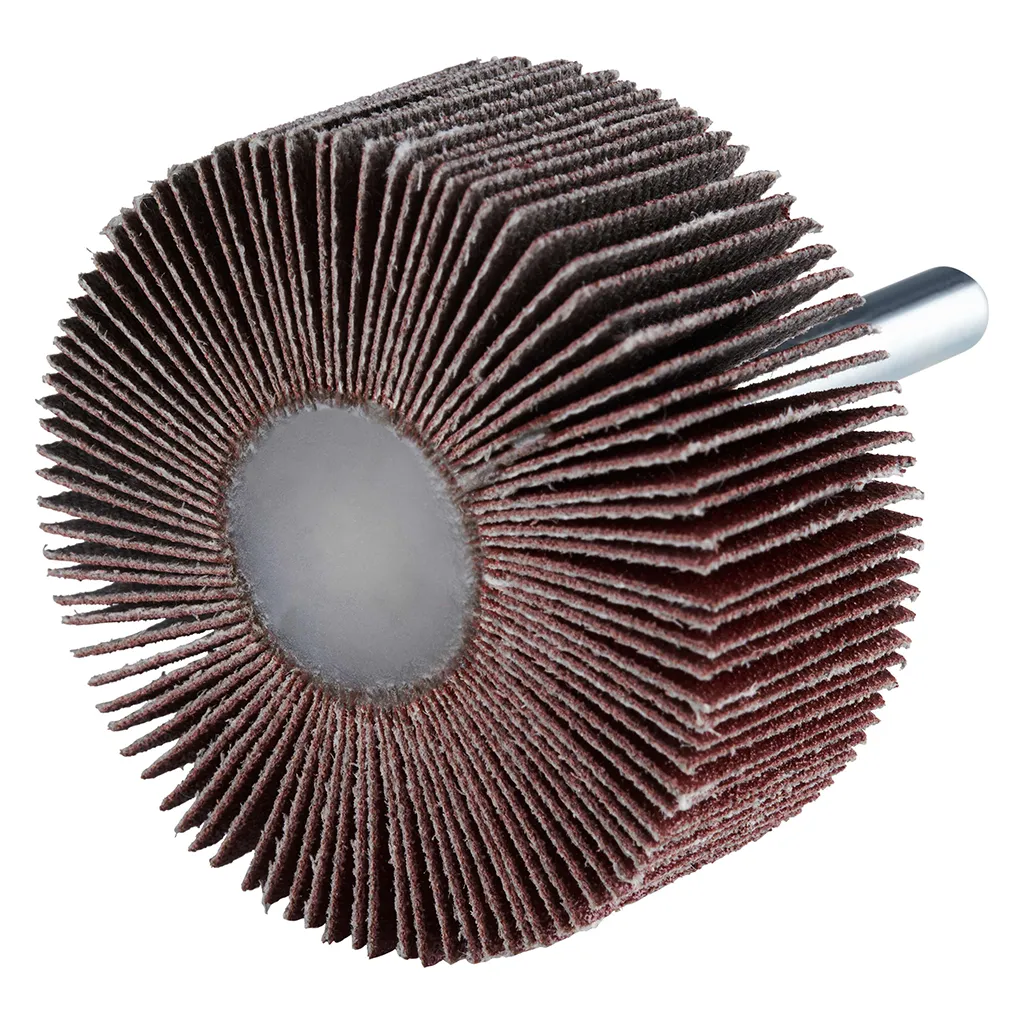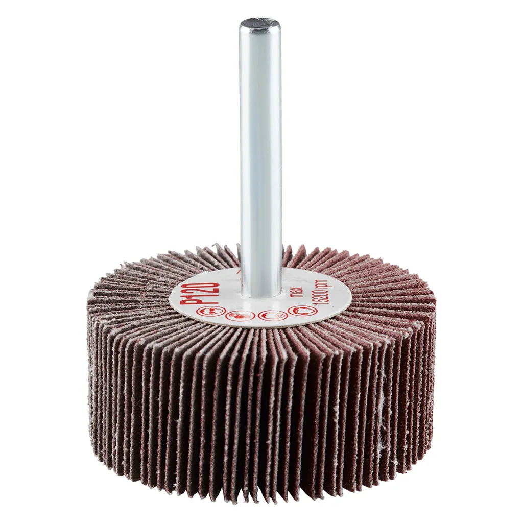 La roue à lamelles FS de RHODIUS a été conçue pour être utilisée sur les meuleuses droites ou les machines à entraînement d’arbre flexible avec logement de tige de 6 mm.