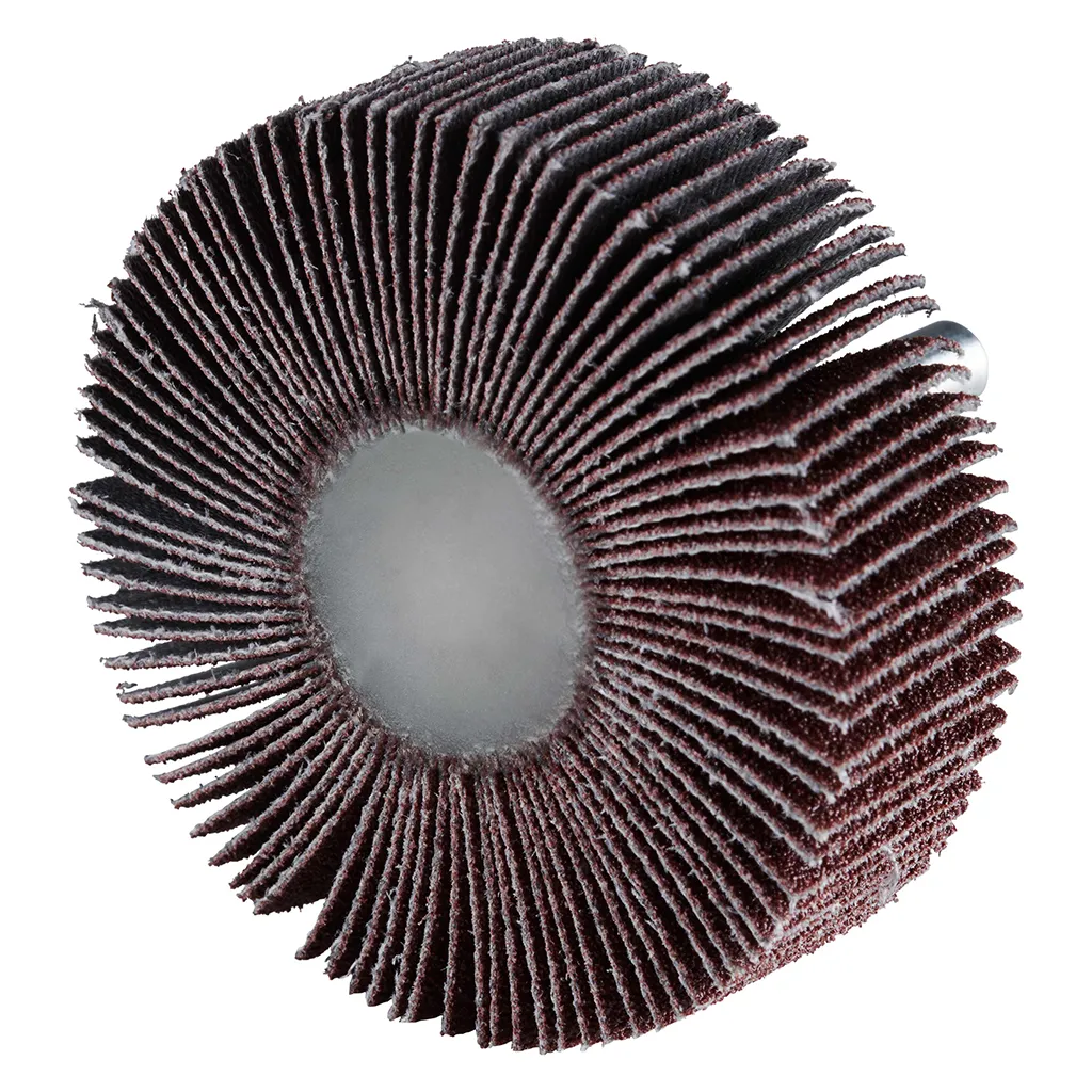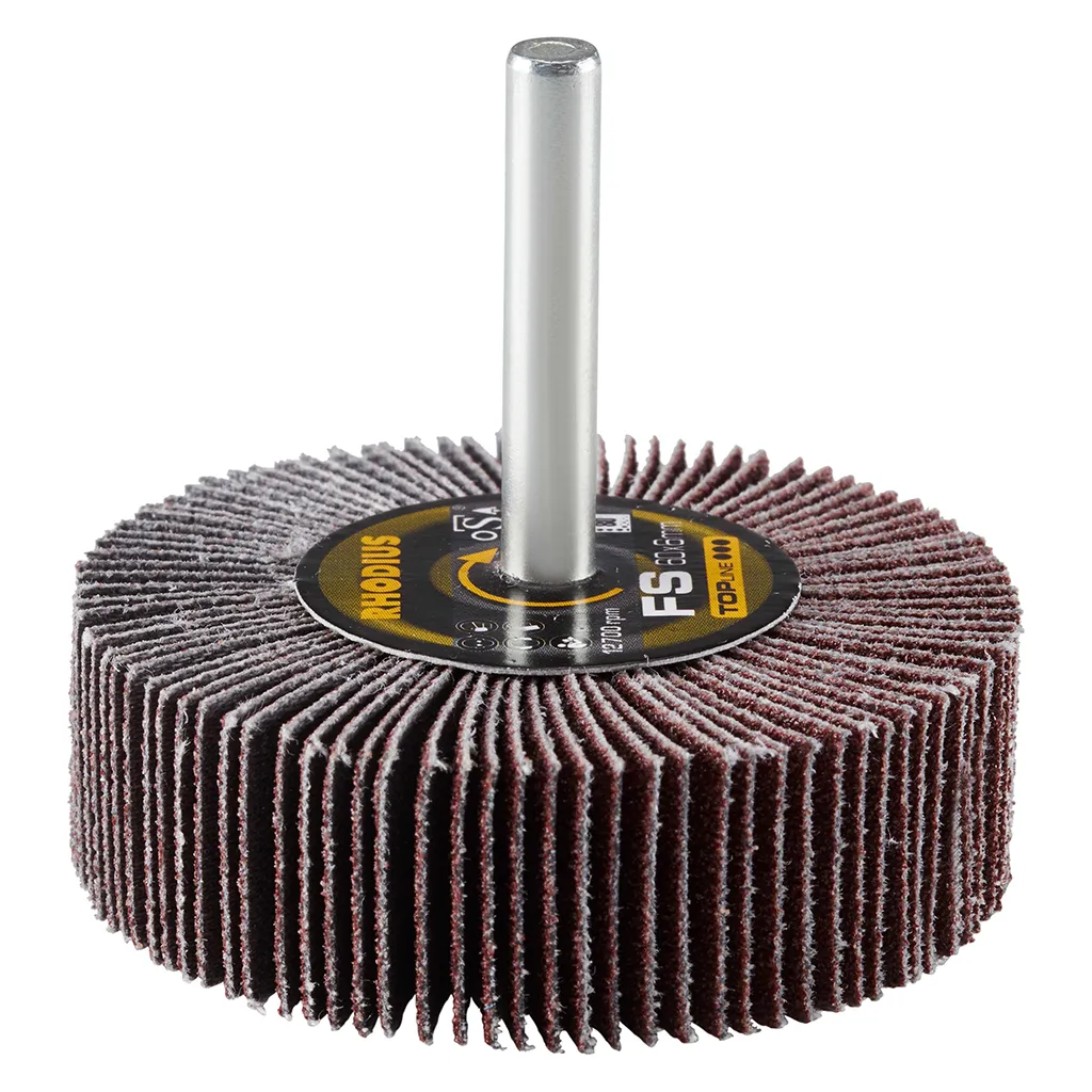 La roue à lamelles FS de RHODIUS a été conçue pour être utilisée sur les meuleuses droites ou les machines à entraînement d’arbre flexible avec logement de tige de 6 mm.