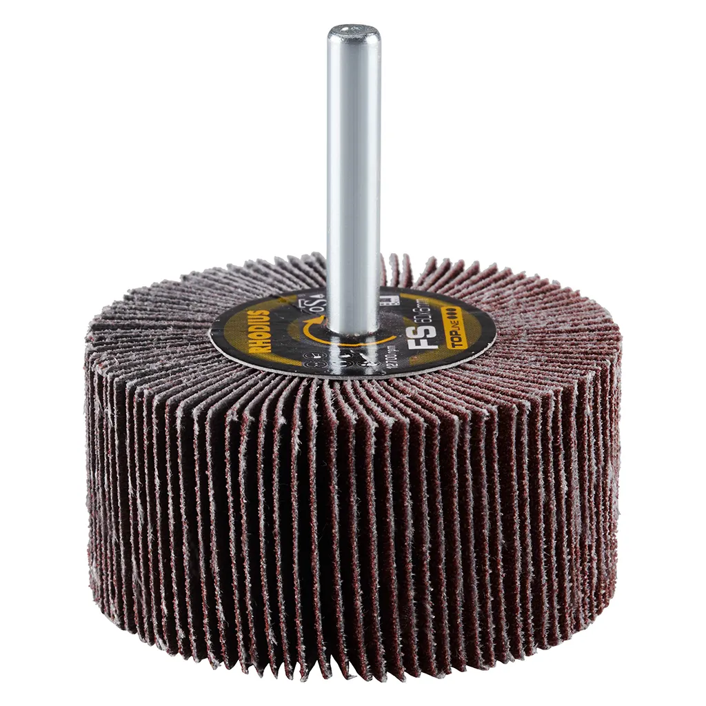 La roue à lamelles FS de RHODIUS a été conçue pour être utilisée sur les meuleuses droites ou les machines à entraînement d’arbre flexible avec logement de tige de 6 mm.