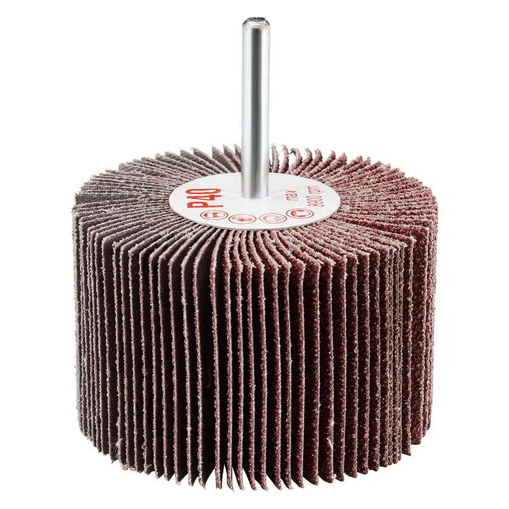 La roue à lamelles FS de RHODIUS a été conçue pour être utilisée sur les meuleuses droites ou les machines à entraînement d’arbre flexible avec logement de tige de 6 mm.